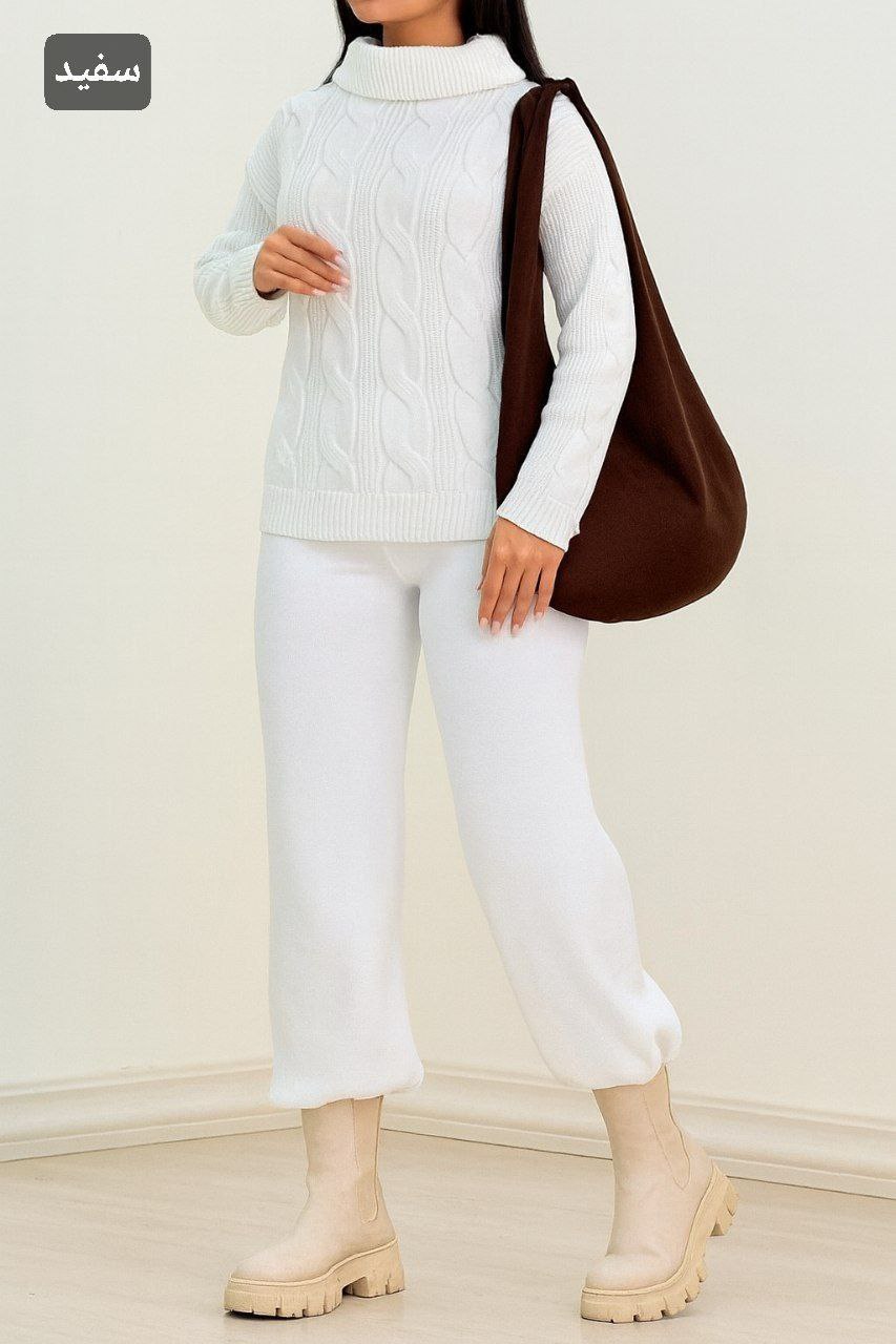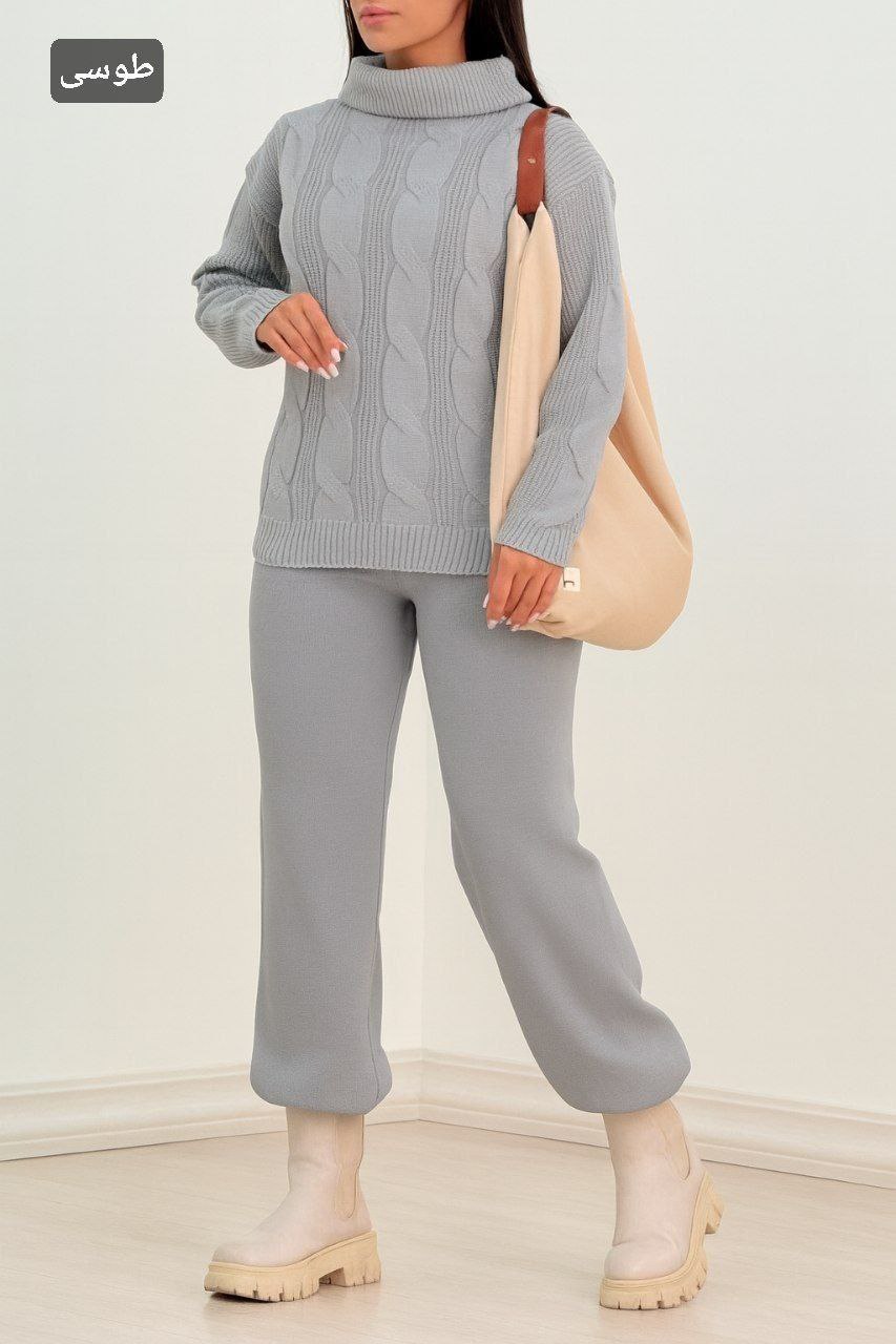ست بافت یقه شل مارپیچی زنانه و دخترانه ، ست بلوز و شلوار بافت زنانه و دخترانه