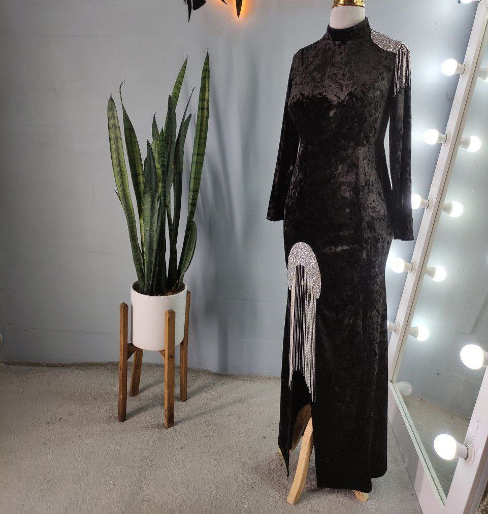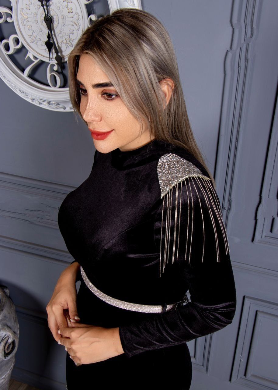 لباس مجلسی زنانه و دخترانه طاووس مخمل مشکی با سرشانه و پایین زنجیر
