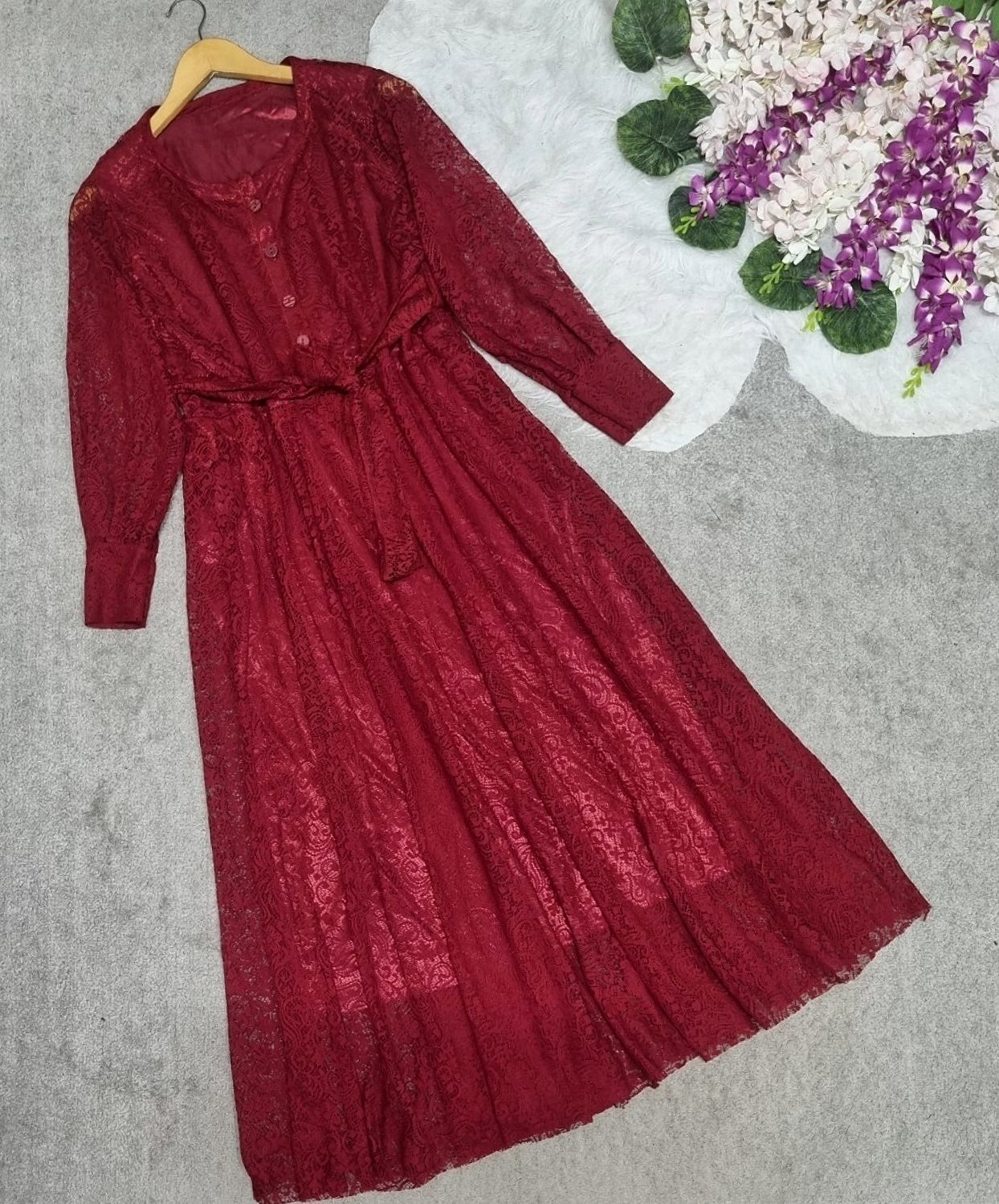 🏷 شناسه: #43758💎 نام:  مدل عروس📋 توضیحات:  قد 133دورسینه 104استین از کنار یقه 64بازو  38دکمه ها کاربردی😍کمربند از جنس خود لباس تنخور فوق العادهههههه اصلا احتیاج به تعریف نداره، کاملا مشخصه😎🥰💎 جنس:  گیپور استر دار💎 رنگ بندی:  زرشکی - نسکافه⚜️ سایز ها:  فری36تا44