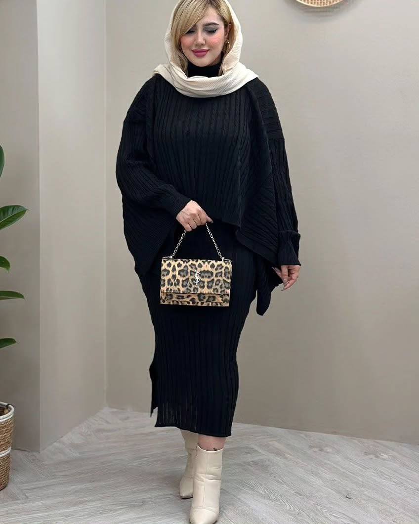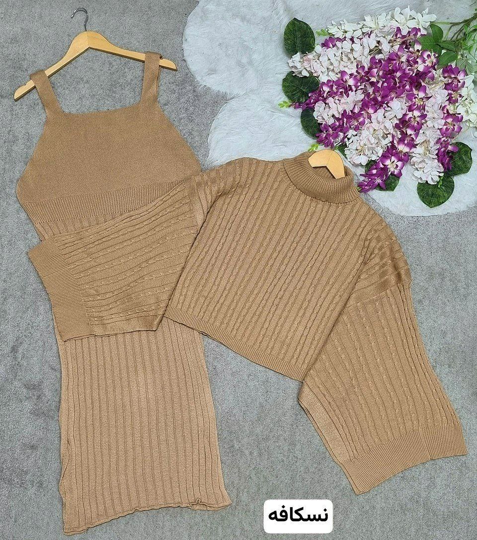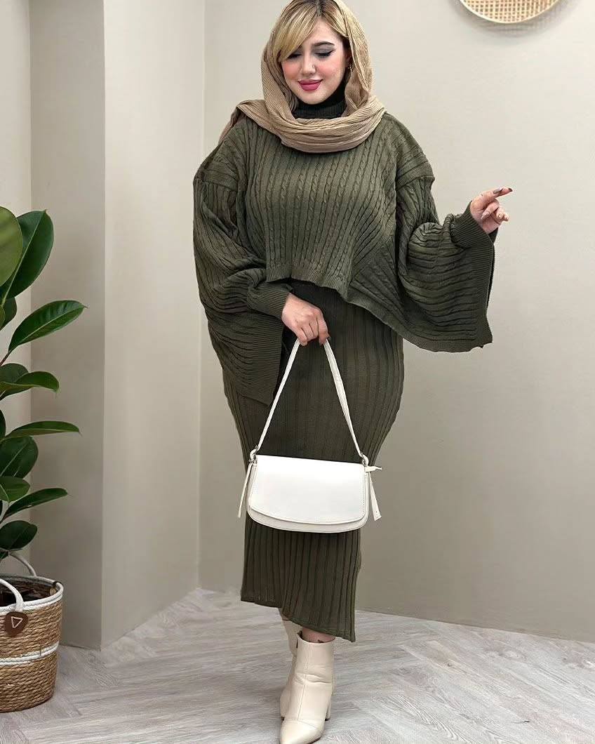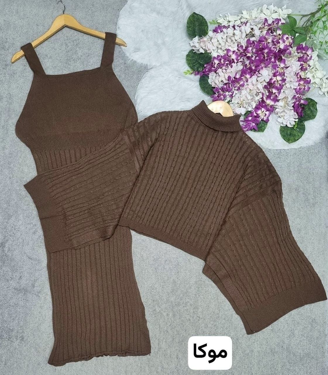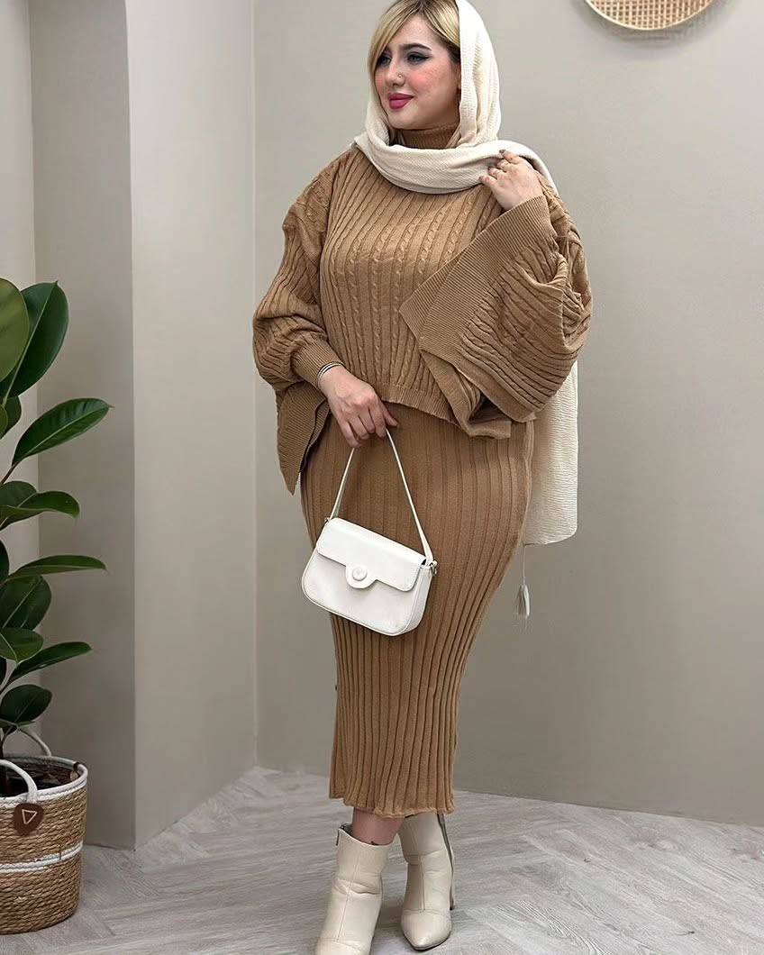 ست دو تیکه بافت زنانه و دخترانه پاییزه و زمستانه، ست بافت دو تیکه سارافون و رویه شیک و جدید و ترند