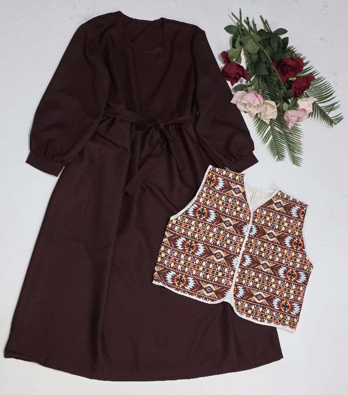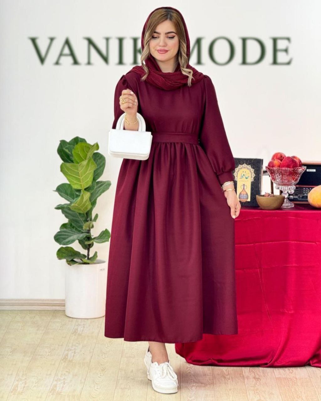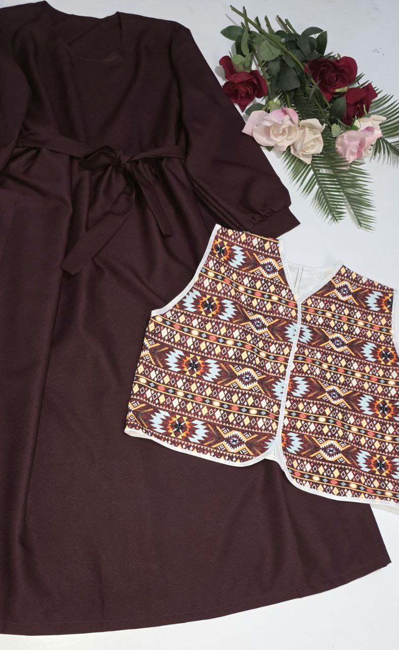 🏷 شناسه: #99999💎 نام:  مدل جواهر📋 توضیحات:  ✅سایزبندی:فری تا46🍀توضیحات:دور سینه سارافن 108قد 130جلیقه قد 45☘کمربند دار، سارافن چین دار✅کیفیت کاملا مزونی💎 جنس:  ژیله مازراتی درجه یک پیراهن کرپ اندونزی درجه یک💎 رنگ بندی:  زرشکی⚜️ سایز ها:  فری💰