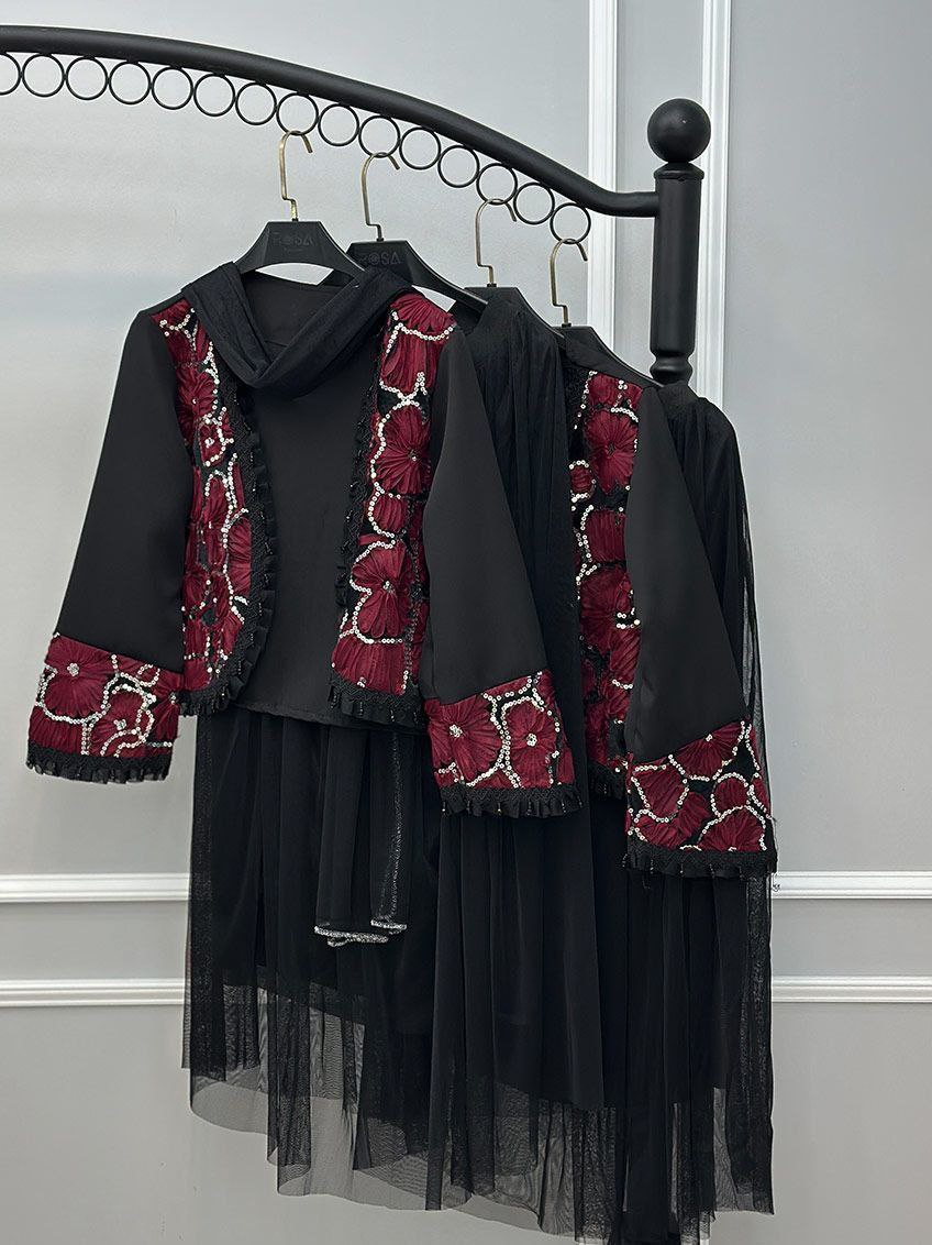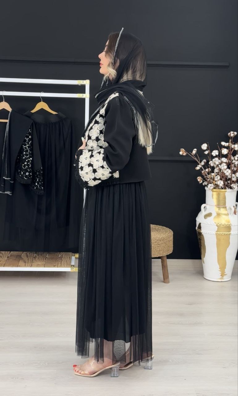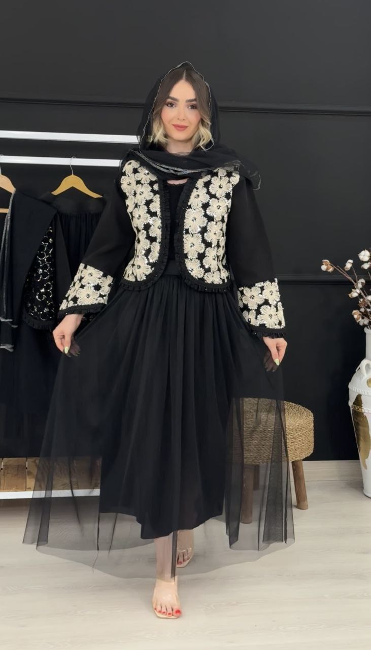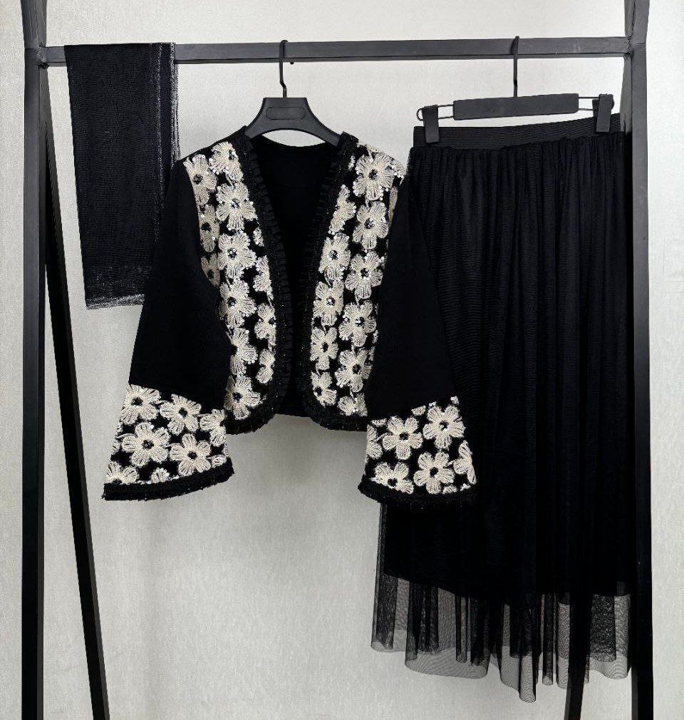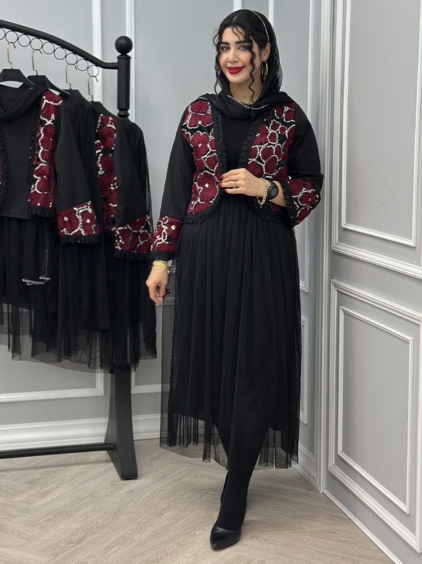 ست سه تیکه کت و دامن و شال عیدانه زنانه ، ست سه تیکه کت و دامن و شال مازراتی تور خرجکار هندی زنانه شیک و جدید و عیدانه